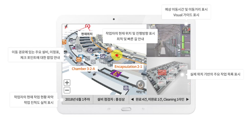 3D 시설물 관리 MAP과 증강현실 기술을 접목하여 생산 현장의 Mobile 기반의 Smart Work 환경을 제공합니다.