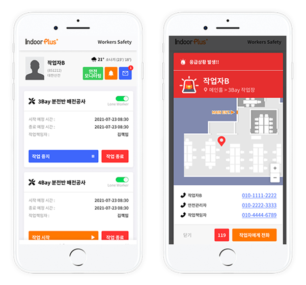 또한 IndoorPLus+ SmartSafe에서 처음 소개하는 생체데이터 모니터링은 당사가 의료 분야에서 이미 실증 및 상용화를 마친 실시간 생체데이터 모니터링 서비스를 작업자 안전에 도입한 혁신적인 서비스입니다. 작업장에서 혼자 있는 작업자가 미처 SOS 신호를 보낼 수 없을 경우를 대비하여 작업자가 착용하는 기기를 통해 심박, 체온 등의 기초 데이터를 지속적으로 모니터링하여, 건강지표에 이상신호가 감지되면 응급호출을 보내기 전에 먼저 조치를 취할 수 있는 선제적 안전장치입니다.