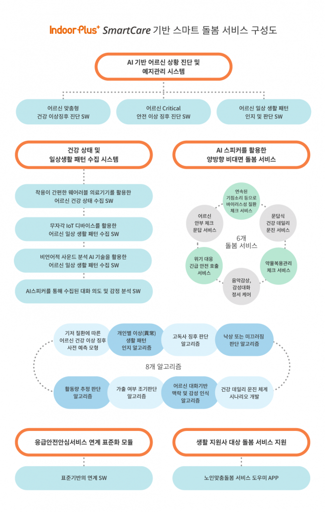 피플앤드테크놀러지는 위 언급한 예시에서 비언어 AI음성기기, 웨어러블 의료기기, 각종 환경 센서를 제공하는 기업들과 협업하여 당사의 AI/IoT 플랫폼인 IndoorPlus+ Smart Care 플랫폼을 스마트 노인돌봄 플랫폼 형태로 확대 하여 모든 IoT/IoMT 기기와 호환할 수 있도록 작업할 예정이며 이번 과제에서는 노인별 개인화된 생활패턴 데이터의 수집,분석,가공,판단을 거쳐 적시적소에 공유해 주는 데이터 서비스 플랫폼 역할을 하게 된다.
