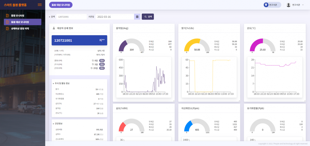 또한, IoT 디바이스로 돌봄 대상자 주거 내 환경데이터(움직임, 밝기, 온도, 습도, 이산화탄소, 유기화합물) 등을 수집하며, 모니터링하다가 상태에 이상 징후가 있을 경우 지자체로부터 개인 맞춤형 돌봄 서비스를 제공받는다.