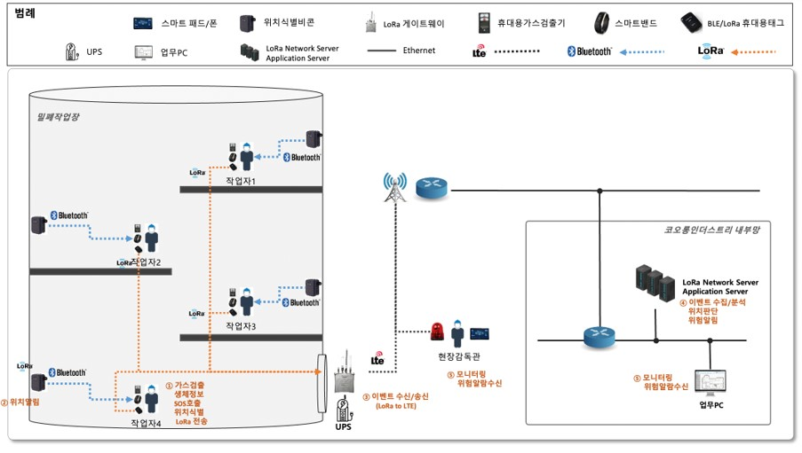 밀폐구역 작업자 안전 관리 모니터링 시스템은 위치 식별 비콘, 가스 검출기, 스마트 밴드에서 송신한 정보를 BLE/LoRa 휴대용 태그가 수신해 LoRa 게이트웨이를 통해 서버로 전송한다. 중장비 근접 작업자 충돌 방지 시스템은 중장비 운전자 및 주변 작업자가 태그를 통해 위험 지역 근접 시 경보 신호를 수신하며 해당 중장비와 작업자의 위치와 정보는 LTE 또는 LoRa 망을 통해 실내외 구분 없이 전송하며 별도의 네트워크 공사 없이 Cordless RTLS 작업자 안전 관리 시스템을 도입하여 산업현장에서 인명사고 발생 시 즉시 모니터링을 가능하게 만들었다.