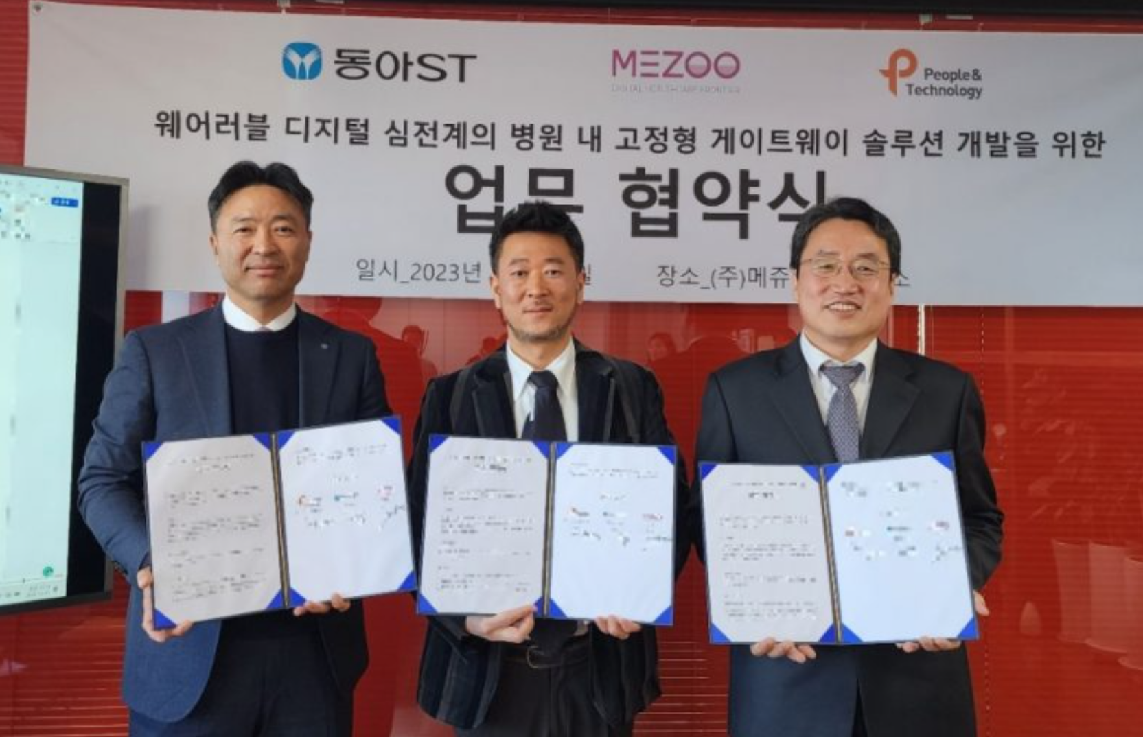 엔터프라이즈 AI(인공지능) 서비스기업 피플앤드테크놀러지는 지난 12월 21일 서울 강남구 메쥬(Mezoo Co.) 사무실에서 메쥬, 동아에스티(Dong-A ST)와 병원내 실시간 환자 모니터링을 위한 IoMT(의료기반 사물인터넷) 게이트웨이 솔루션 개발과 플랫폼 구축을 위한 업무협약을 체결했다.