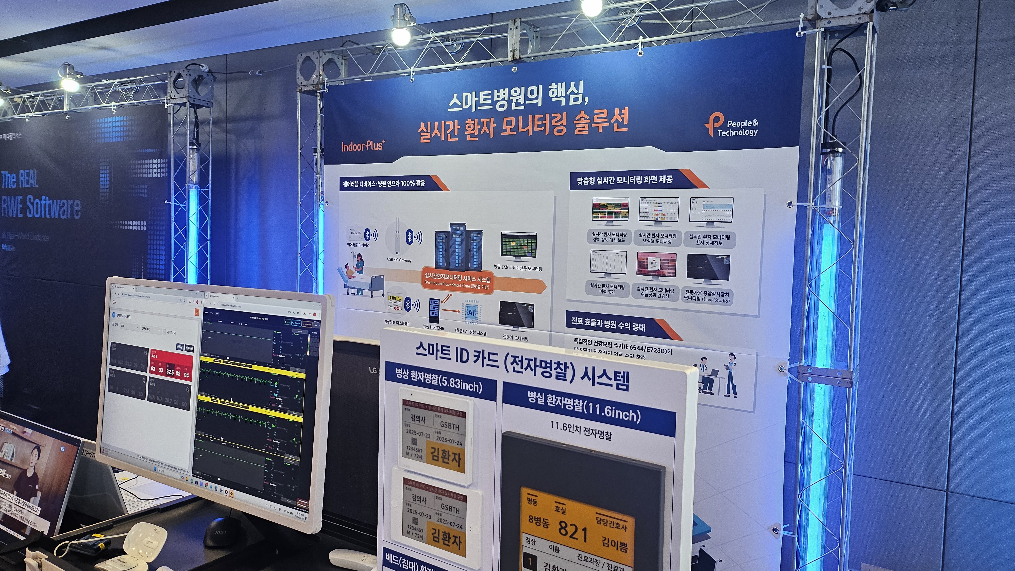 피플앤드테크놀러지는 전시실 10번 부스에서 'IndoorPlus+ SmartCare' 플랫폼 기반 실시간 환자 모니터링 솔루션을 시연했다. 현장에서는 패치형 심전도 웨어러블 기기 '하이카디'와 '노닌' 산소포화도 측정기를 플랫폼에 연동해, 환자 생체 신호와 움직임 데이터가 병동 모니터링 화면에 실시간으로 표시되는 과정을 라이브로 선보였다.