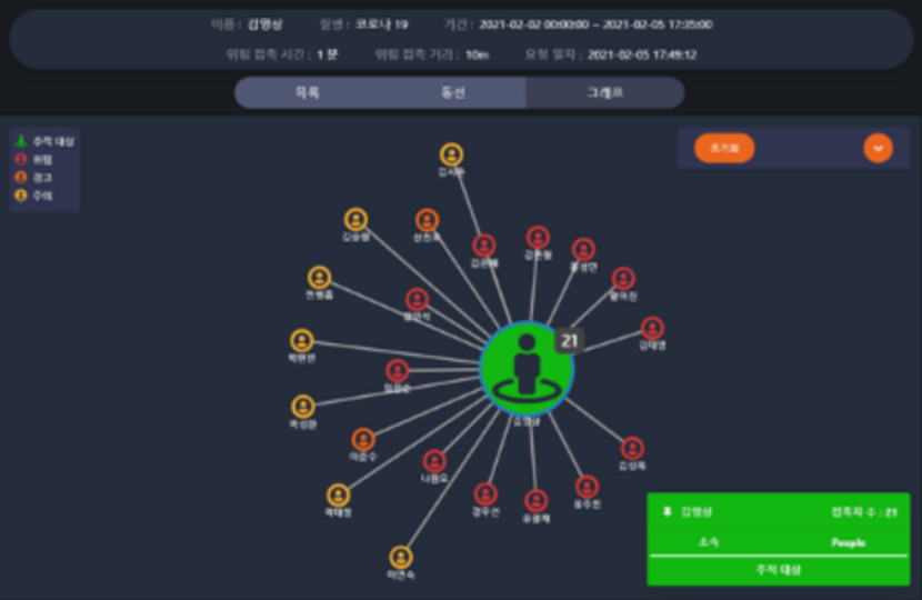 N차 접촉자 검출이 가능하며, 밀접 접촉 정도를 점수화 하여 감염 확산 위험도를 정량적으로 평가할 수 있습니다.