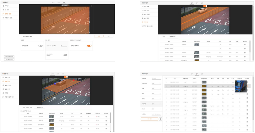 도로 방범 주요 기능은, ① 통행차량검출 ② 차량번호인식 ③ 역주행 ④ 속도측정 ⑤ 차량유형 ⑥ 불법주차 검출 등의 AI 분석 기능을 지원합니다.