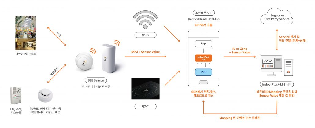 IndoorPlus+ LBS는 실내 공간에 설치된 Bluetooth 비콘 신호를 스마트폰, 태블릿 등 모바일 기기를 통해 수신하여