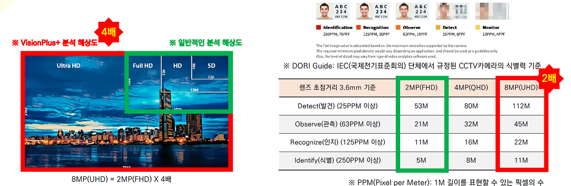 VisionPlus+ AI CCTV는 8MP(UHD) 해상도를 직접 분석하여 FHD 대비 넓은 화각과 원거리 객체를 높은 정확도로 분석할 수 있습니다.