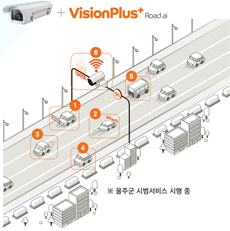 도로 방범 주요 기능은, ① 통행차량검출 ② 차량번호인식 ③ 역주행 ④ 속도측정 ⑤ 차량유형 ⑥ 불법주차 검출 등의 AI 분석 기능을 지원합니다.