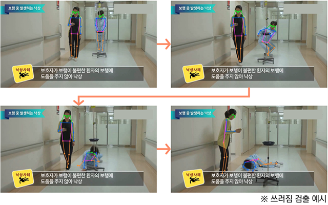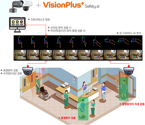 낙상이나 이상 행동도 실시간으로 인식하여 작업자 또는 환자의 안전을 효과적으로 관리합니다. 또한 불꽃·연기 감지 AI로 화재 예방에도 기여합니다.