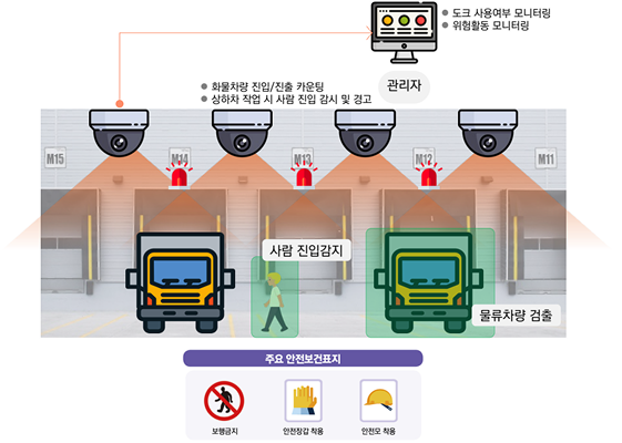 또한, 물류 현장에서는 도크에 접안하는 화물차의 입출차와 상하차 작업 시, 사각지대에 접근하는 작업자를 감지해 충돌 사고를 예방하며, 현장 전반의 안전성을 높입니다.